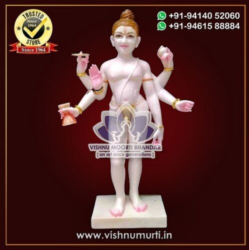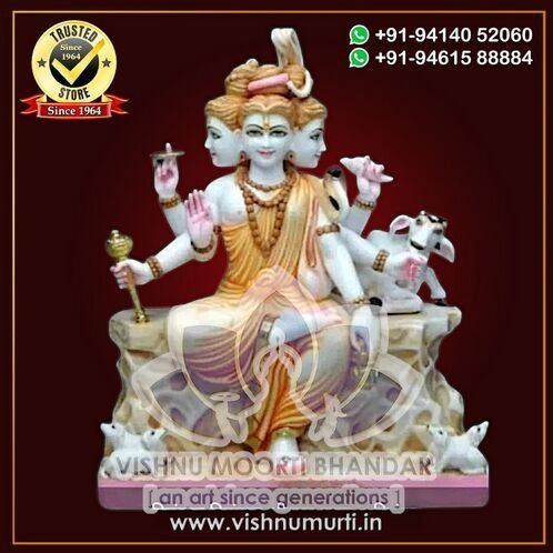Carved from premium-grade white marble, the murti features three serene faces, six arms holding symbolic items, and is often accompanied by four dogs and a cow — representing the Vedas and Mother Earth. The fine detailing and smooth finish reflect master craftsmanship and timeless devotion.